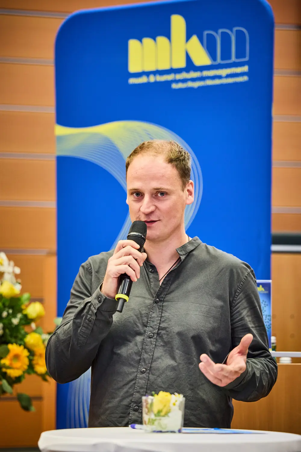 Die Sicht des Spitzenmusikers brachte Matthias Schorn ein. Er ist Soloklarinettist an der Wiener Staatsoper bzw. bei den Wiener Philharmonikern und erzählte davon, wie Musik in seiner Kindheit Emotionen ausgelöst hatte. „Möglichst viele Kinder sollten das Glück haben, das auch zu spüren.“ Auch Fabian Mittermayer, Konzertmeister des Jugendsinfonieorchesters Niederösterreich, sprach sich dafür aus, dass jedes Kind die Möglichkeit haben sollte, zumindest elementar Musik zu machen, denn „ich kann durch Musik ausdrücken, wofür ich keine Worte habe“, so der talentierte junge Musiker, der die Musikschule in Klosterneuburg besucht hatte und mittlerweile am Mozarteum in Salzburg studiert.