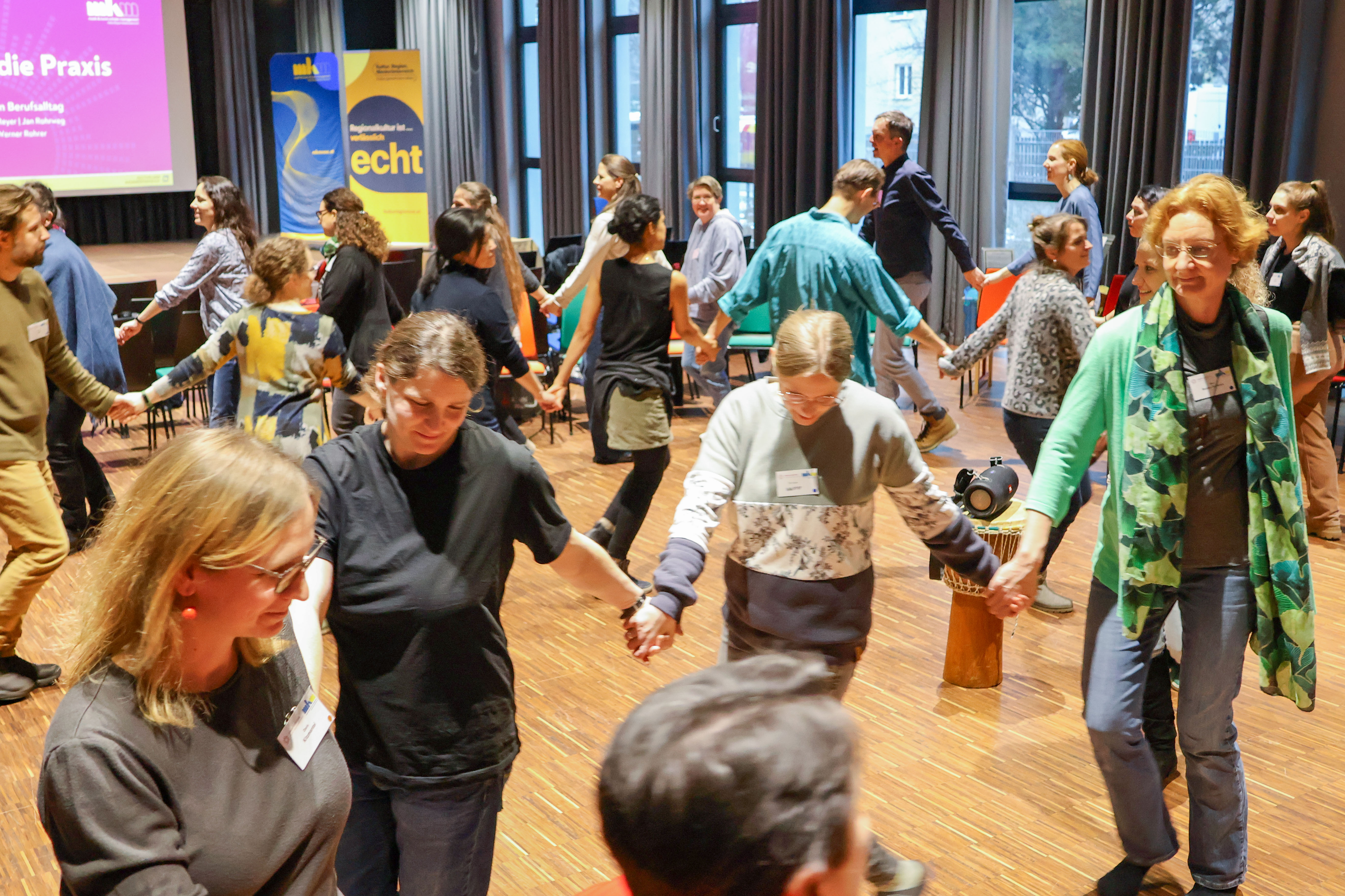lustige Kinderlieder vor, mit denen musikalische Fertigkeiten mit Hilfe von Bewegung erlernt werden. Marlies Reyer, die an der Regionalmusikschule Sieghartskirchen unterrichtet, präsentierte Ideen für die Verknüpfung von Bewegung und Tanz im Raum mit dem Spielen von Musikinstrumenten.