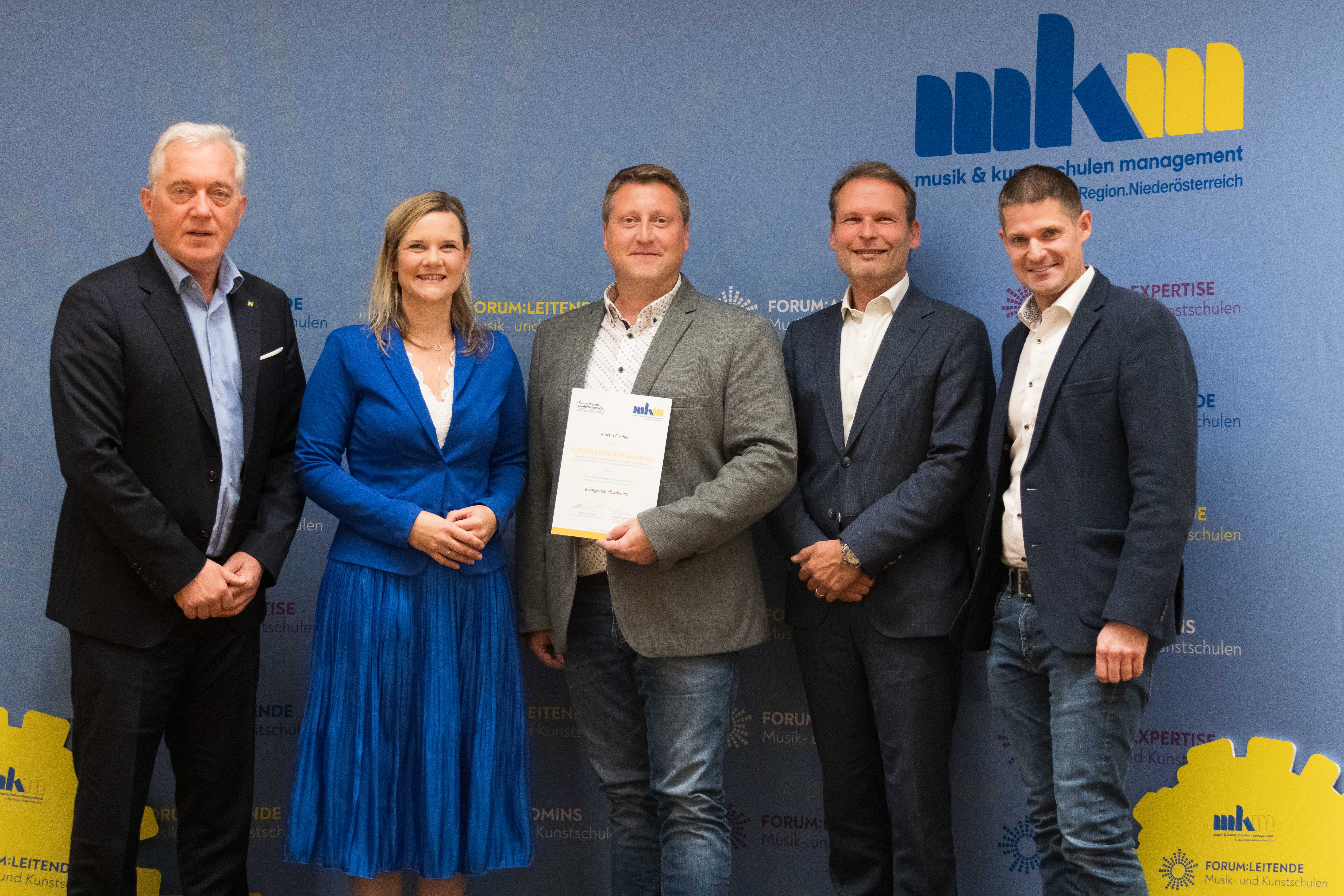 Gruppenfoto Absolvierende © MKM NÖ BU: Mehr als 200 Musikschulleitende haben den Lehrgang des MKM NÖ bereits besucht Martin_Fischer1.jpg © MKM NÖ BU: Von links: Martin Lammerhuber (GF Kultur.Region.Niederösterreich), Tamara Ofenauer-Haas (GF MKM NÖ), Martin Fischer (Leiter der Musikschulen Fladnitztal und Paudorf-Gedersdorf), WHR Dir. Johannes Landsteiner (Leiter der Kommunalakademie NÖ), Harald Schuh (Leiter der W. A. Mozart Musikschule Horn, Regionsbeirat MKM NÖ) Gerne stellen wir Ihnen weiteres Bildmaterial zur Verfügung.